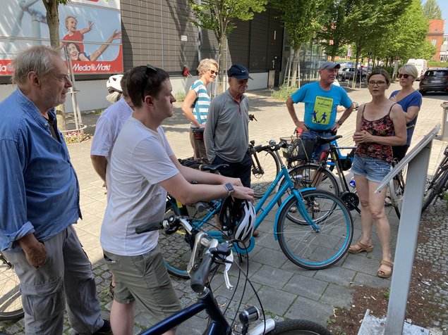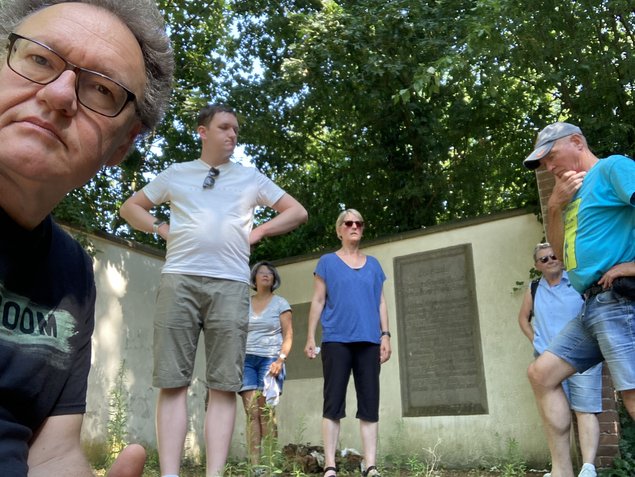 Nienburg. Der Ortsverband der GRÜNEN hatte eingeladen, um vor dem gemeinsamen Besuch des „Weserbeatz“auf der Festwiese, mit einer kleinen Radtour interessante Orte mit NS-Vergangenheit in Nienburg aufzusuchen. Mechthild Schmithüsen, Sprecherin der Ortsverbands, hatte intensiv recherchiert und die Fakten zu den verschiedenen Orten zusammengetragen. Die Gruppe besuchte unter anderem den jüdischen Friedhof, die Gedenktafel der zerstörten Synagoge, das sogenannte „braune Haus“ und den künftigen Gedenkort für das Kriegsgefangenenlager STALAG XC hinter dem Nienburger Krankhaus. „Es gibt auch hier in Nienburg viele Orte und Anlässe an die Verbrechen der NS-Zeit zu erinnern. Einige Orte sind ausführlich dokumentiert und auch für die Bürgerinnen gut kenntlich gemacht. Es ist aber schon erstaunlich, wie mühsam es in anderen Fällen ist, die einzelnen Fakten zusammenzutragen und die konkreten Orte überhaupt zu finden“, so Mechthild Schmithüsen. Es sei dringend wünschenswert und erforderlich, dass man sich auch weiterhin in den Schulen intensiv mit den Geschehnissen hier vor Ort auseinandersetze, um Geschichte für die Schüler*innen konkret zu machen, die Erinnerung an diese Zeit und die grausamen Schicksale der Menschen wach zu halten, gerade mit Blick auf die aktuellen Entwicklungen des Erstarkens des Rechtspopulismus in aller Welt. Die Gruppe der Teilnehmenden regte an, im Rahmen der Neugestaltung der Innenstadt die Gedenktafel für die Synagoge auf die Lange Straße zu holen, um mehr Bürger*innen und Tourist*innen auf die Geschichte der Zerstörung aufmerksam zu machen. Auch könne der Sammelpunkt am Schlossplatz, an dem die letzten Jüdinnen und Juden der Stadt zum Abtransport in die Vernichtungslager im Osten zusammengetrieben wurden, mit einer Tafel in Erinnerung gebracht werden. Bei Besichtigung des jüdischen Friedhofs wurde gebeten zu prüfen, ob die Stadt Nienburg die regelmäßige gärtnerische Pflege der Gedenkstätte im jüdischen Friedhof mehr unterstützen könne. Die anwesenden Ratsmitglieder Regine Pflüger, Dorian Spange und Peter Schmithüsen sagten zu, all die gesammelten Anregungen und Ideen über die zuständigen Ausschüsse und Arbeitsgruppen in die Planung zur Innenstadtentwicklung einzubringen. Nach fast drei Stunden Fahrt und einem intensiven
